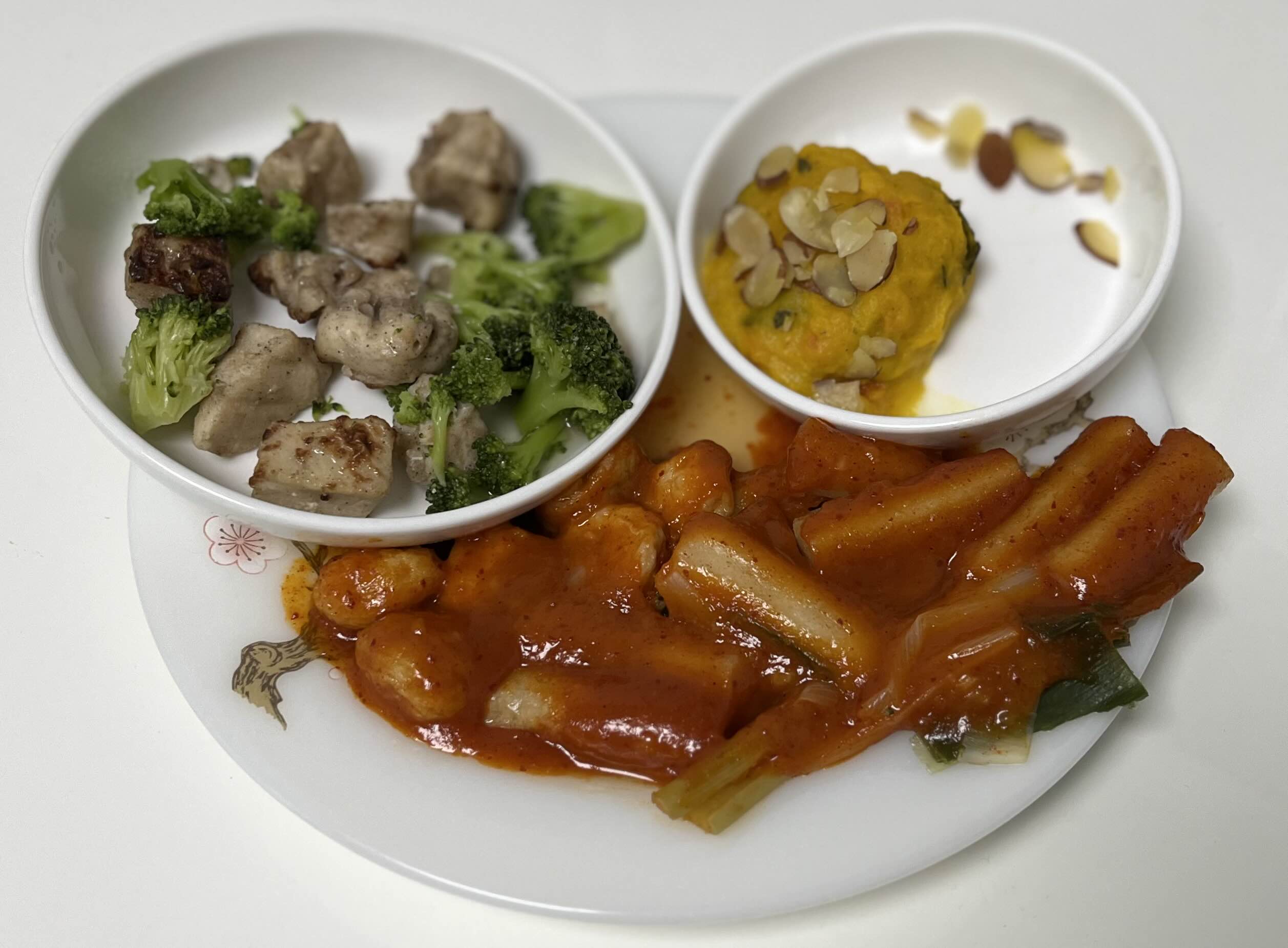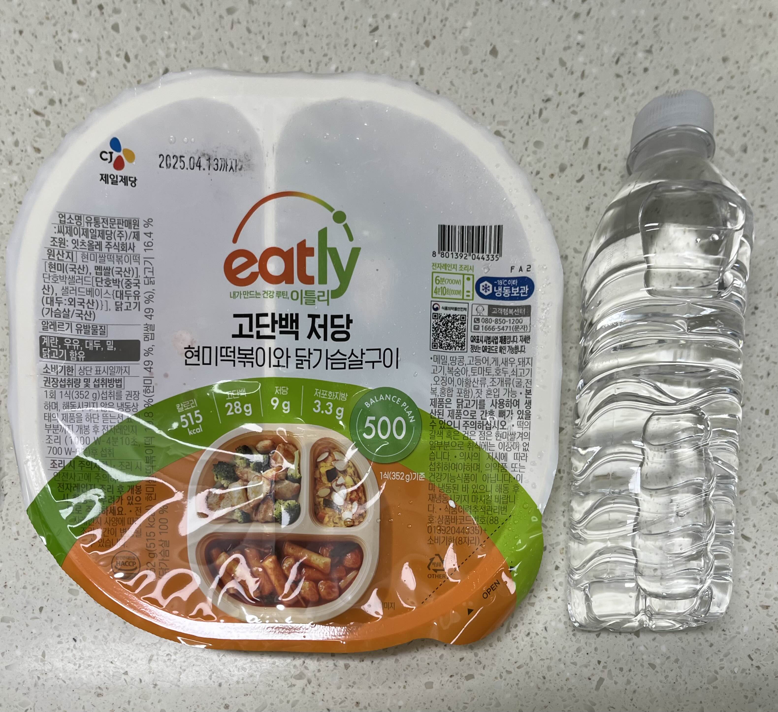 냉동입니다. 구성은 현미 떡볶이 + 동그란 오뎅, 브로콜리 + 닭 가슴살 구이, 단호박샐러드입니다.