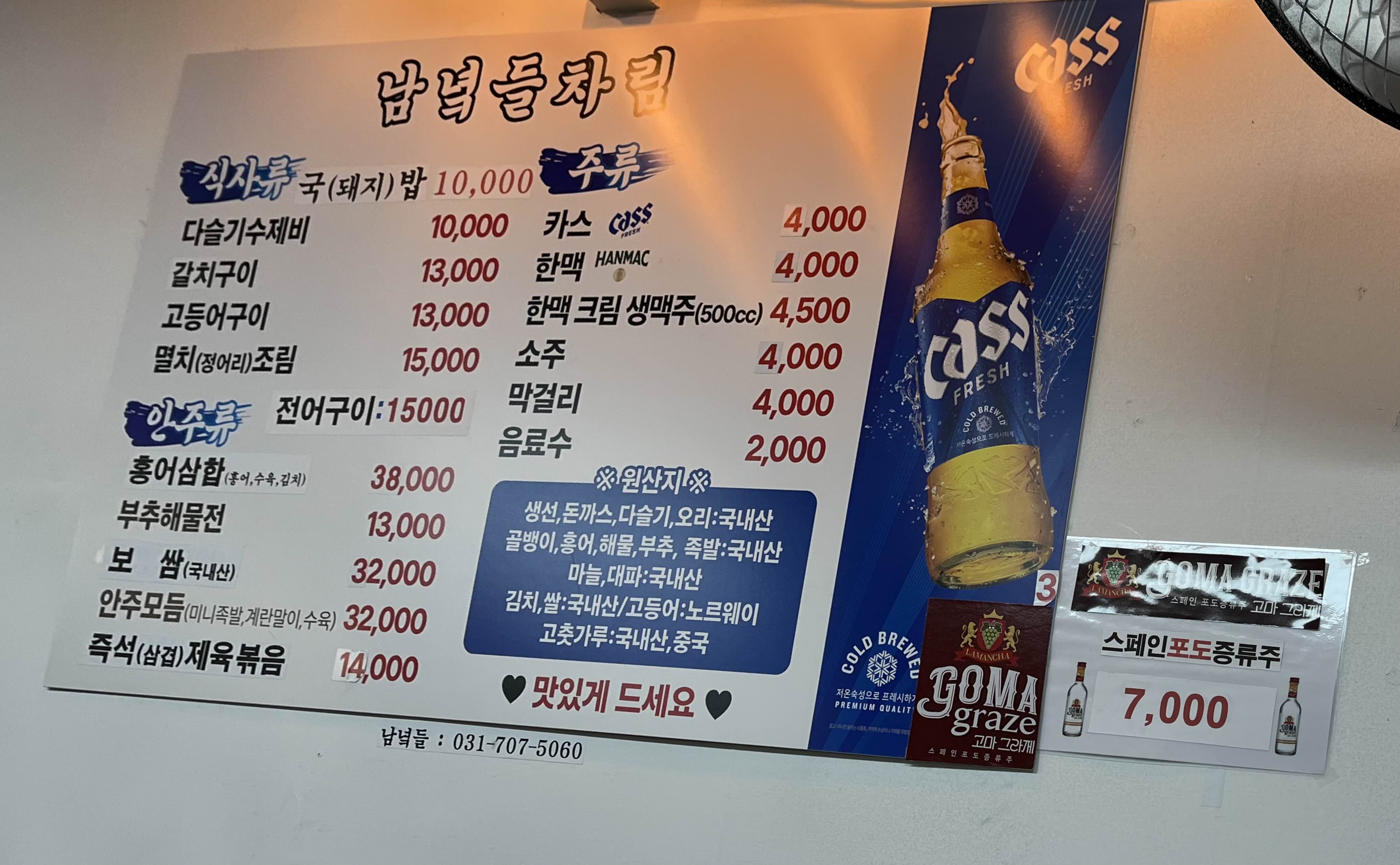 이외에도 메뉴는 돼지국밥, 고등어구이,갈치구이, 멸치 조림(정어리 조림)있고, 술안주 메뉴로 홍어삼합, 부추해물전, 보쌈, 즉석 제육볶음, 안주모듬(미니족발, 계란말이, 수육)이 있습니다.
